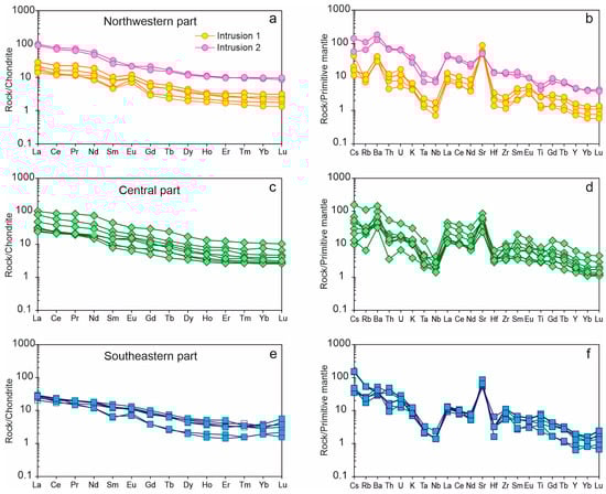 The chondrite-normalized rare-earth element (REE) patterns of the Yamaat Uul complex (Figure 10a,c,e) are flat to moderately enriched in the light REE (LREE): Lan = 5.9–44.6, La/Smn = 0.9–4.8 and La/Ybn = 3.9–16.1 (Table 3). All samples are characterized by medium-fractionated REE patterns that are slightly depleted in heavy REE (HREE): Gd/Ybn = 1.7–3.0. The level of REE concentrations in the monzogabbro of Intrusion 2 (Figure 10a) is higher than that in the rocks of Intrusion 1 (Figure 10a,c,e) in all parts of the complex. The REE patterns of leucogabbro and anorthosite samples of the Northwestern and Southeastern parts show small positive Eu anomalies (Figure 10a,e), suggesting fractionation of plagioclase.