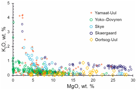 The rocks of the Northwestern part form two groups on the binary diagrams (Figure 9). The first group is low-K and high-Sr gabbroides (MgO, 0.51–6.41 wt.%; K2O, 0.12–0.28 wt.%; Sr up to 1831 ppm) represented by leucogabbro and anorthosite (Figure 5c,h). The second group is high-K and low-Sr gabbroides (MgO, 12.53–15.83 wt.%; K2O, 0.33–0.56 wt.%; 1061–1236 ppm) that are Bt-Am-Ol gabbros and gabbronorites (Figure 5c,h). The rocks of the Southeastern part from the complex are similar in composition to the first group of the Northeastern part, but with less variability.