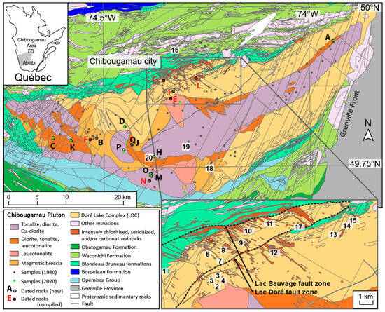 Geological map of the Chibougamau pluton and hosting material modified from the Ministère de l’Energie et des Ressources Naturelles (MERN), Québec (projection UTM NAD83 zone 18N). The inset is a zoom on Central Camp, which is the historical mining camp of the Chibougamau area. The letters refer to ages listed in Table 1. The numbers locate deposits and showings listed in Table 2.