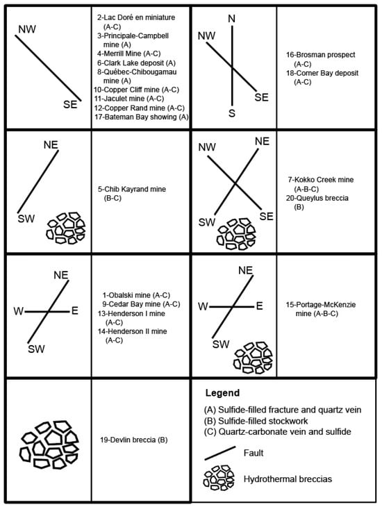 | (10) Copper Cliff mine | quartz–sulfide-filled fractures and mineralized Cu(-Au) quartz–carbonates veins | [] |