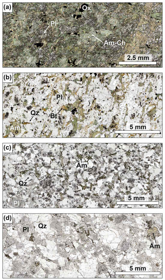 The 2020 samples are dominated by plagioclase (±sericitized), amphibole, biotite, and quartz with minor amounts of amphiboles, epidote, apatite, titanomagnetite, titanite, and zircon. Similar mineral assemblages characterize the 1980 sample suite [,]. A more detailed petrographic study was performed on the eleven samples used for geochronology (Figure 3). These eleven samples are dominated (35–50 vol%; Table S2C) by euhedral and extensively hydrolyzed plagioclase that is most altered in mafic samples (Figure 3a). Hornblende is an important phase (10–20 vol%) in intermediate rocks (Figure 3b), dominates (55 vol%) mafic rocks (Figure 3a), and is a minor phase (5 vol%) in felsic samples (Figure 3c,d). Hornblende is generally replaced by actinolite and chlorite, especially in the hydrated mafic samples (Figure 3a), and is with biotite in intermediate to felsic rocks (Figure 3b). Quartz, an interstitial phase most abundant in felsic rocks (to 45 vol%), is associated with orthoclase (5 vol%; Table S2C). Epidote occurs as a secondary mineral, although coarse epidote inclusions in amphibole grains (sample ACR-19-3) may have a magmatic origin. The main oxide is titanomagnetite (2–5 vol%), which occurs as magnetite with ilmenite oxy-exsolutions and as isolated magnetite and ilmenite grains. Ilmenite is generally rimmed by titanite or is entirely replaced by titanite in rocks with <1–2 vol% oxides prior to regional greenschist facies metamorphism (D2 event).