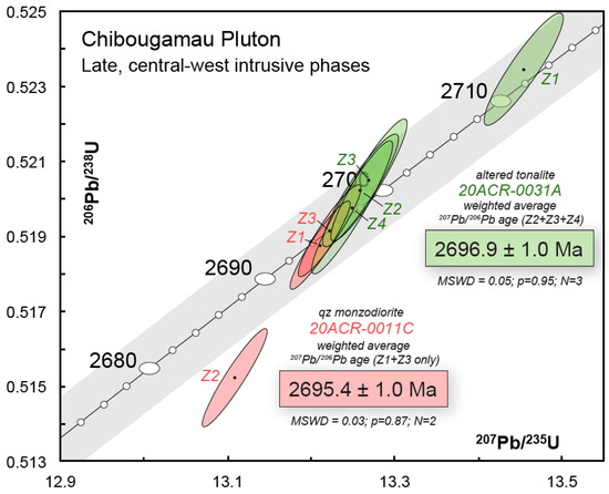 The mineralization both intersects and is intersected by aphanitic to feldspar porphyritic dykes (tonalite and diorite) that are genetically related to the Chibougamau pluton, as determined by field relationships and whole-rock chemistry [,,]. Additionally, the ages of ca. 2714–2715 Ma observed for two of the dykes relate them to an intrusive phase of the pluton (Table 1). Thus, an important observation is that these dykes are considered to be inter-mineral dykes and provide evidence for the overlap of magmatic and hydrothermal activity [].