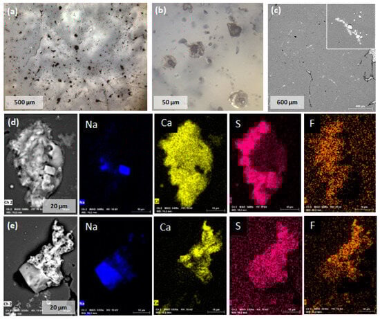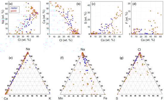 The fluid chemistry was further evaluated using the evaporate mound analysis (EMA) method, whereby salt mounds (i.e., precipitates) are obtained by overheating FIs []. Prior to heating, samples were soaked several times in acetone and dried to preclude surface contamination. The chips were then heated to 465 °C using a Linkham stage at a rate of 50 °C/min, and then rapidly cooled to room temperature. This procedure produced abundant isolated mounds for the two studied samples. Quartz chips were subsequently mounted on double-sided carbon tape adhered to a petrographic glass slide, carbon-coated, and then imaged and analyzed using the same SEM-EDS noted above. The EDS analysis used a 20 kV accelerating voltage, a 1.2 nA beam current, a working distance ranging from 15 to 18 mm, and an acquisition time of 5 s. Imaging (BSE and CL) used a 15 kV accelerating voltage and a 1.0 nA beam current. The EMA was performed using both point and raster modes [] and data were processed using the Burker software. The chemical data were normalized to 100 wt% without SiO2 to correct for interference from the quartz substrate.