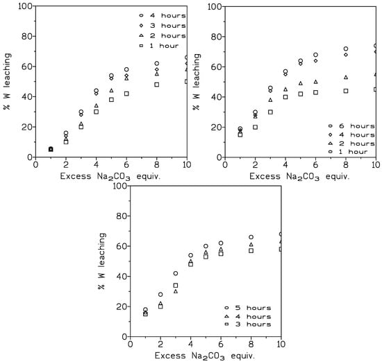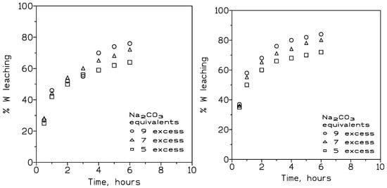 From this figure, it is observed that the increase in temperature increased dramatically the rate of tungsten leaching. In the case of using 100 °C (Figure 2, left), it is not possible to obtain yields higher than 80%, even after 6 h of reaction, utilizing a greater excess of sodium carbonate. But on the other hand, when the reaction temperature rises to 200 °C, yields above 90% are achieved even for reaction times as short as 30 min, and even when using an excess of sodium carbonate (5–7 equivalents in excess) below the best result obtained at 100 °C (9 excess equivalents).