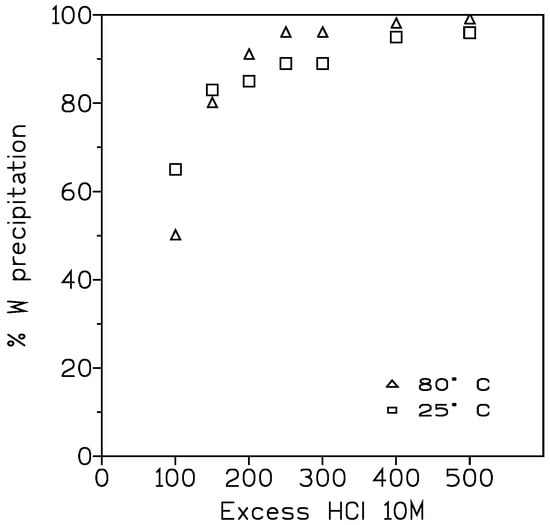 As expected, in the leachates, tungsten is present in the form of Na2WO4, allowing the use of these solutions as a starting point to synthesize smart tungsten products. Thus, experiments were carried out to yield tungstic acid from these solutions by precipitation of the acid using HCl 10 M. Figure 4 shows the results obtained from this series of experiments by plotting the percentage of tungsten recovery (as tungstic acid) versus the percentage in excess of HCl 10 M used to precipitate the acid. This excess refers to the stoichiometry of Equation (3):