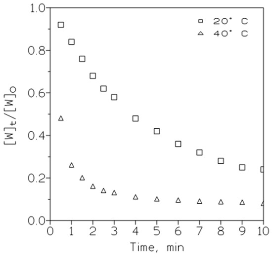 The variation in temperature influenced this precipitation (Figure 5); the elimination of tungsten from the solution is favored by increasing the temperature from 20 to 40 °C.