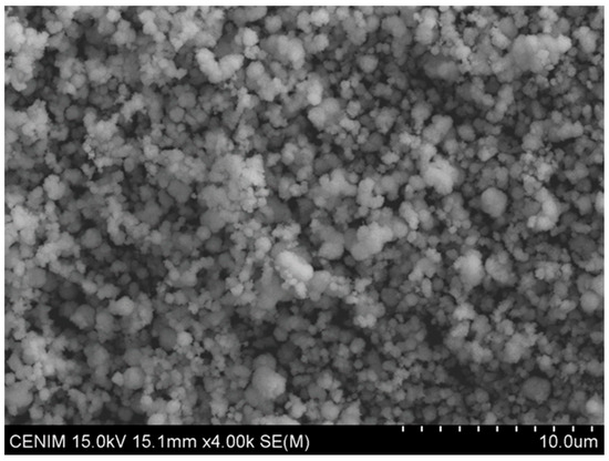 Undoubtedly, this solid belongs to the tungsten oxides family presenting oxygen vacancies (oxygen vacancies in WO3−x stoichiometry) [,,]. SEM imaging (Figure 13) shows that the solid presented a conformation of agglomerated nanoglobules with a typical size of 70 nm (Figure S6, Supplementary Materials). The XRD results (Figure S7, Supplementary Materials) showed that the solid is basically amorphous.