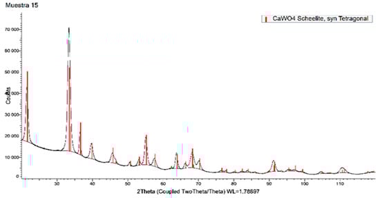 It is necessary to use an excess of CaCl2 with respect to the stoichiometry of Equation (4), and this excess is quantified to be around 15% of the stoichiometric ratio. Also, it is necessary to maintain the solution pH value above 8. On the other hand, to yield a precipitate with a finer particle size it is necessary to add the calcium chloride solution on top of the sodium tungstate solution. Figure 6 shows an SEM image of the synthetic scheelite precipitated at 40 °C, where the solid precipitates as semi-spherical granules. Figure 7 shows the XRD spectrum of the same sample, from this Figure 7, and it can be seen that the solid has crystallized in the tetragonal system.