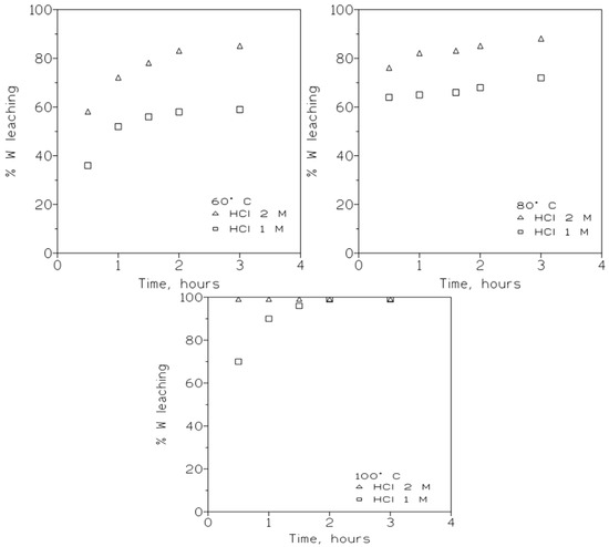 These results indicated that for short reaction times, on the order of half to one hour, the leaching process is very sensitive with respect to time and temperature. In short, the tungsten dissolution increases with the increase in both variables, which seems to indicate that chemical reaction control predominates in this zone [,]. As the reaction time increases, the leaching yield is less sensitive to the change in this variable (HCl concentration), which seems to indicate that the leaching occurs under diffusional control [].
