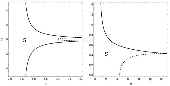 Representation of the local stability region S of the interior fixed point of Model (1) in the parameter space bifurcation diagram. In S, the conditions of local stability given in Remark 1 are satisfied for . In the left figure, , while in the right figure, . When the parameters cross the curves (solid and dashed), a bifurcation occurs. The period-doubling bifurcation occurs when the parameters cross the dashed curve, whereas the Neimark–Sacker bifurcation appears when the parameters cross the solid curve. The fixed point loses stability and a new phenomenon is born.