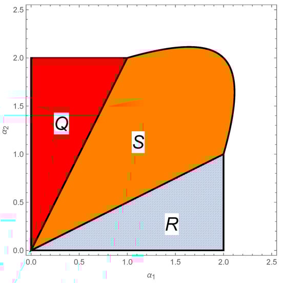 Representation of the stability regions Q, S, and R of the equilibrium points in the two-species Ricker competition model (2) when and in the parameter space . In region R, the fixed point on the axis is locally asymptotically stable, with a period-doubling bifurcation at and , with as a bifurcation parameter. In region Q, the equilibrium point on the axis is locally asymptotically stable, with a period-doubling bifurcation at and , with as a bifurcation parameter. In region S, the interior fixed point is locally asymptotically stable. On the curve (a hyperbola), a period-doubling bifurcation occurs with respect to the parameters and .