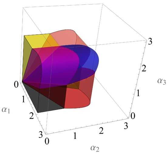 Stability regions of the seven non-trivial fixed points of the 3D autonomous Ricker competition model (2) in the parameter space , when for and for . Details about these regions may be found in [].