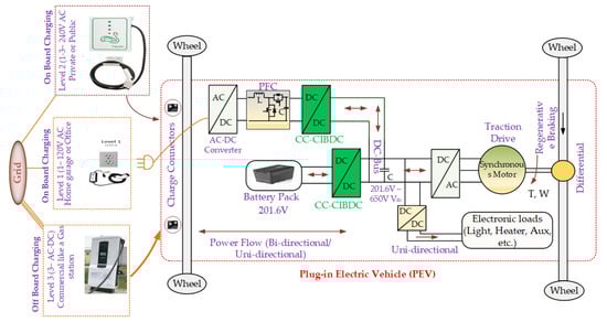 In the modern era, the environment is prone to pollution caused due to various aspects, especially vehicles powered by fossil fuels. As the pollution prone system is becoming of greater concern, replacing these vehicles with plug-in electric vehicles (PEV) is becoming an attractive proposition. To take this technology forward to next level of sophistication, one needs to provide not only an optimal charging system, but also the most effective power conditioning unit to drive the motor more effectively. This results in more flexibility for PHEV customers [,,,]. Usually, a bi-directional DC-DC converter (BDC) is associated with the design of charger as well as the power conditioning unit of an EV or PHEV, as shown in Figure 1, as it allows bidirectional power flow (charging and discharging and similarly during motoring and braking periods respectively).