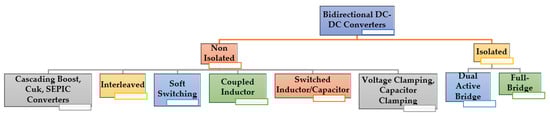 From Equation (1), it can be inferred that by minimizing the capacitor voltage, the inrush current can be minimized, which can be used as an alternative solution to the above-mentioned problem. This fact has motivated the derivation of a new converter, which can offer reduced voltage across the capacitor. In this regard, the capacitor clamped boost inverter (CCBI) concept has been found to be a suitable solution []. However, this paper does not deal with the inrush concept and bi-directional power flow application in dc-dc power conversion. This knowledge gap has motivated the utilization of the CCBI concept along with the coupled inductor concept to derive a new converter and to carry out its performance investigation in the above-mentioned directions. This newly derived converter has been named the capacitor clamped coupled inductor BDC (CCCI--BDC). All the reviewed dc-dc power converter topologies have been presented as a flowchart in Figure 2.