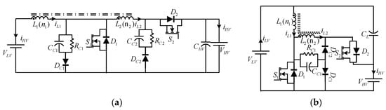 The broad categorization of these BDCs refers to isolated (transformer based) converters and non-isolated (transformer less) converters. Conventional isolated converters are used to meet the high gain requirements of EVs, which provides the flexibility of reduced operating voltages at the battery side in the design of EVs. For this purpose, step-up natured isolated converters, e.g., flyback, push-pull, current-fed half bridge, and current-fed full bridge topologies, are preferred with the adoption of a suitable transformer turns ratio. However, this solution suffers from large voltage spikes due to the leakage inductance of the transformer, in turn, leading to a power loss in the switch. Thus, non-isolated BDC is preferred when compared with isolated BDC, as it has several advantages, such as high efficiency, more reliability, and less component count, which lead to a reduced size and overall cost [,]. In general, high gain is obtained in the case of transformerless converters by having a high duty cycle. However, the price to pay is the increasing reverse recovery losses and reduced efficiency. Moreover, the reliability of the switches is also affected due to high voltage stress because of the high duty ratio. To overcome these issues, ample converter topologies have been proposed in the literature, namely cascading boost converters [], interleaving topology, soft switching technique to mitigate voltage spikes, and incorporating a coupled inductor in the conventional boost topologies [].