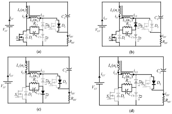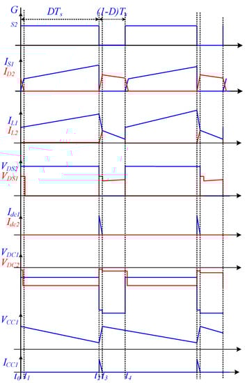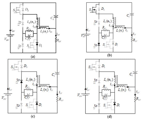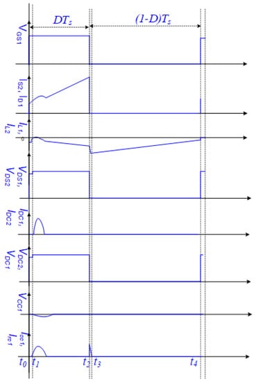 Figure 4 illustrates the characteristic waveforms of the CCCI-BDC converter boost mode operation. The gate pulses of switch (Vg1) which triggers boost mode and gate pulses of switch (Vg2) which triggers buck mode are complimentary. Let boost switch (S1) and buck switch (S2) duty cycles be assumed as and , respectively. Here, T represents the time period of switches S1 and S2. In the forward boost mode, switch (S1) operates in pulse width modulated mode and diode D2 operates in freewheeling mode. The boost mode operation is further classified into four operating modes in a switching period, and equivalent circuits of individual modes are illustrated in Figure 5.