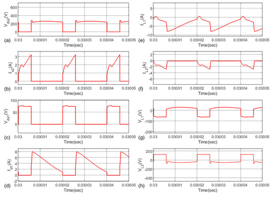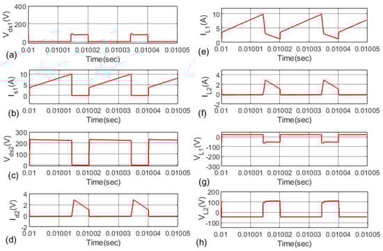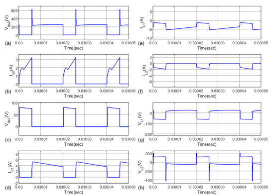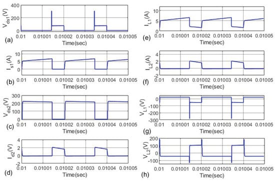 Simulation results of switch (S1) voltage and current, switch (S2) voltage, diode (D2) current, and coupled inductor currents in both sides (primary and secondary), as well as the coupled inductor primary voltage and secondary voltage during discharging (boost) mode of CCCI--BDC operation are presented in Figure 12a–h, respectively. Similar results have been captured during discharging (boost) mode of VCCCCI--BDC for the purpose of comparative analysis and presented in Figure 13a–h, respectively.