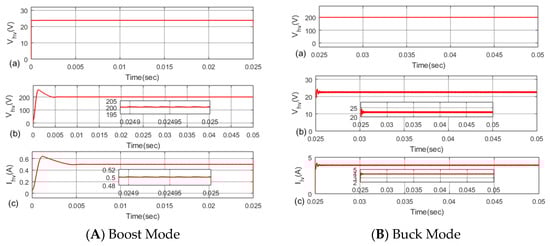 Simulation results of (a) input voltage, (b) output voltage and (c) output current, (A) discharging (boost) mode of operation (B) charging (buck) mode of operation.