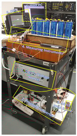 Hardware setup of CCCI-BDC (1. Supply and Load Terminals, 2. Proposed Converter, 3. FPGA Altera Kit, 4. Voltage sensors along with conditioning elements and Current sensors along with conditioning elements 5. DSO, and, 6. Host PC).