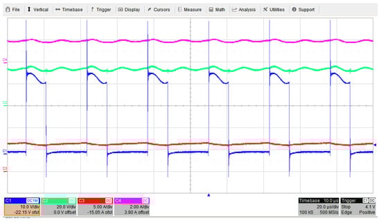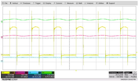 CCCI--BDC parameters in boost mode: The device parameters of lower switch (S2) (blue) (10 V/div), load voltage (green) (20 V/div), load current (red) (5 A/div) and input current (pink) (2 A/div).