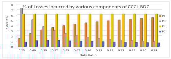The calculation of losses and efficiencies of CCCI-BDC and CI-BDC was carried out by considering the equivalent circuit with various parasitic components and the relevant formulas are shown in Table 8. Figure 20 depicts the losses incurred in various components of the CCCI-BDC in relation to the duty ratio, which is calculated using the aforementioned formulas. According to these findings, at lower duty ratios, the diode is the main source of losses among all other components of the converter. MOSFETs, on the other hand, cause more losses at higher duty ratios. Capacitor losses are lower when compared to other components. The proposed converter’s efficiency is 93.8% at the rated values, as shown in Table 3. In similar way, CI-BDC efficiency calculation is also carried out and found to be 93.2%. Hence, it can be understood that the proposed converter not only reduces ripples as well as the stresses on capacitors and devices, but also improves efficiency.