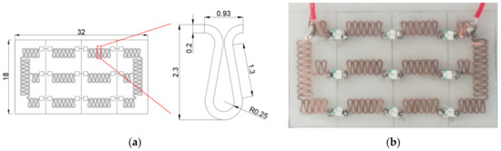 A 3 × 3 LED array circuit was fabricated by the above process. As shown in Figure 11, the array circuit is mixed with 9 LEDs. The array circuit is 32 mm long and 18 mm wide. The copper foil with thickness of 40 μm was selected, and the double parallel line laser cutting with line spacing of 10 μm was adopted. The excess copper foil outside the wire was stripped by laser assisted to prepare the electrical layer, and the LED was welded on the pad and packaged. The results of deformation test show that the circuit can work normally under bending, folding and torsion. After 50% tension, the circuit still maintains good electrical and mechanical properties.