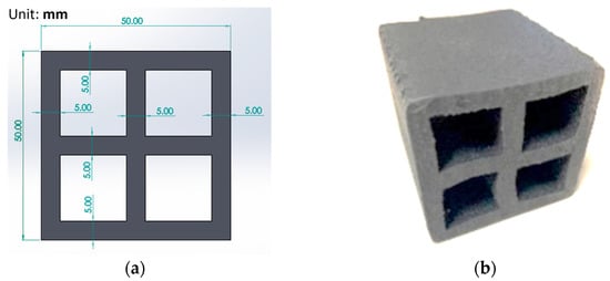 After considering manufacturing feasibility and adjusting the manufacturing parameters, the material of the rod will be extruded through the customized mold. The rod shape was chosen to be a hollow square with an internal support structure, as shown in Figure 1a. The outer dimension of the rod was 50 mm × 50 mm, and the cross supports had a thickness of 5 mm. A photograph of the as-manufactured product is shown in Figure 1b.