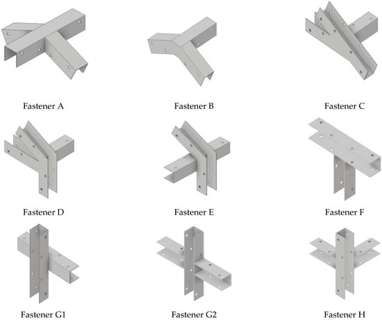 Position and identification number of all fastener types. The symbols, i.e., (A–H), denote the corresponding fasteners shown in Figure 2.