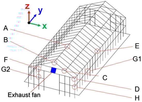 In order to determine whether any fasteners are subjected to resonance, which could potentially cause structural damage under the influence of a dynamic external force, the first 15 orders of resonant frequencies of all fasteners were obtained through analysis utilizing the Inventor software. The selected external vibrations were from earthquakes, and an exhaust fan was erected on the greenhouse walls to enhance air convection. The resonant frequencies of all fasteners are shown in Table 4, and the detailed information is given in Supplementary Materials. The results show that the first six orders of all fasteners were rigid body displacements without fixed constraints, so the obtained frequency is zero for earthquakes in Taiwan, and the frequency falls within 0.8–3 Hz. If this frequency range is expanded to 0.5–4 Hz for an enhanced safety margin, it can be seen, from Table 4, that the vibration generated by the earthquake will not resonate with any of the fasteners to cause structural damage to the greenhouse. From the exhaust fan, which operates at a low operating frequency (125.60 Hz) or a high operating frequency (167.46 Hz), it can be found that the high operating frequency is somewhat close to the 7th order resonant frequency of fasteners B and D, as well as the 8th order resonant frequency of fastener D. However, the difference of the resonant frequencies between fasteners B and D is 7%. Besides, it can be seen from Figure 3 that the two fasteners, i.e., fasteners B and D, have no direct contact rod with the exhaust fan to cause resonance.