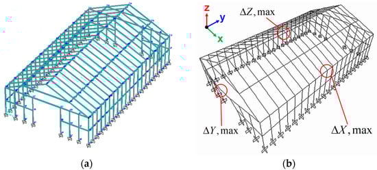 (a) Setup for static stress analysis of the simple greenhouse. (b) Locations where the maximum deflections along the x-axis, y-axis, and z-axis occur under the force 11 wind load.
