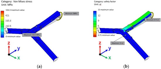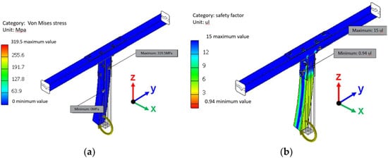 (a) von Mises stress, (b) safety factor of fastener B under x-axis bending moment.