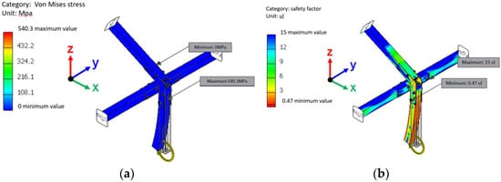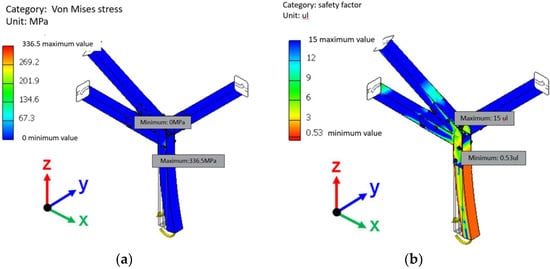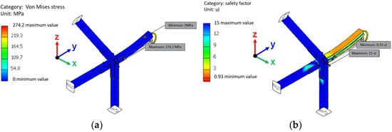The von Mises stress of each fastener was calculated by the Inventor software using the values in Table 2, and the results are shown in Table 3. The detailed analysis results are shown in Figures S2–S19 of Supplementary. In addition, the calculated safety factors for each fastener are summarized in Table 4. It can be seen that the safety factor of all fasteners under axial tension force exceeds 1, which meets the safety conditions. However, the safety factors of fastener B and E under the X-axis bending moment are only 0.71 and 0.93, respectively; furthermore, the respective safety factors of fasteners D, E, and F under the y-axis bending moment are only 0.53, 0.47, and 0.94. Referring to the analysis results shown in Figure 5, Figure 6, Figure 7, Figure 8 and Figure 9, it was found that the positions where the safety factor is less than 1 all fall on the bolt at the junction of the rod and the fastener. The safety factor is calculated on the assembly datum, not just on the fixed point. This means that the bolt holes in the fastener would deform, but this deformation will not affect the overall safety of the fastener.