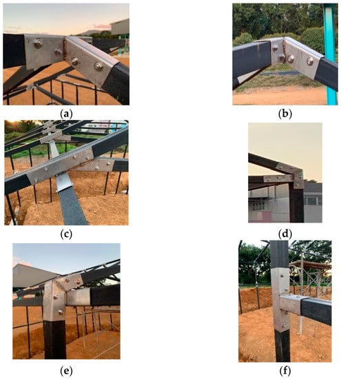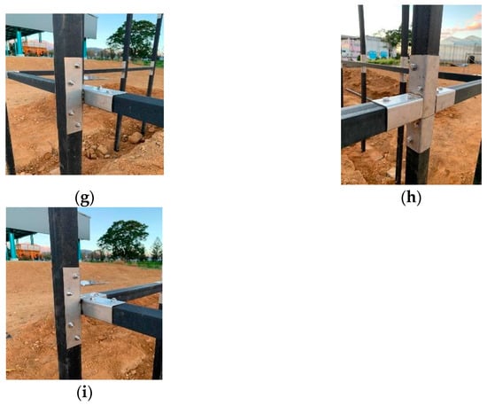 The square shape of the rod means that square-shaped fasteners are required, instead of the typically used fasteners for round rods. The newly designed fasteners are numbered from A to I, as shown in Figure 2. The dimension information is shown in Figure S1 of Supplementary, and the corresponding positions in the greenhouse structure are shown in Figure 3. The fastener material was stainless steel (SUS 304) with a thickness of 2 mm, which is easy to manufacture, low in cost, and has sufficient mechanical strength (tensile strength is 505 MPa; yield strength is 215 MPa; and Young’s modulus is 193 GPa). The properties of the bolts used, and their torque settings, are ignored in this analysis. The process of developing the simple greenhouse is listed as follows:
