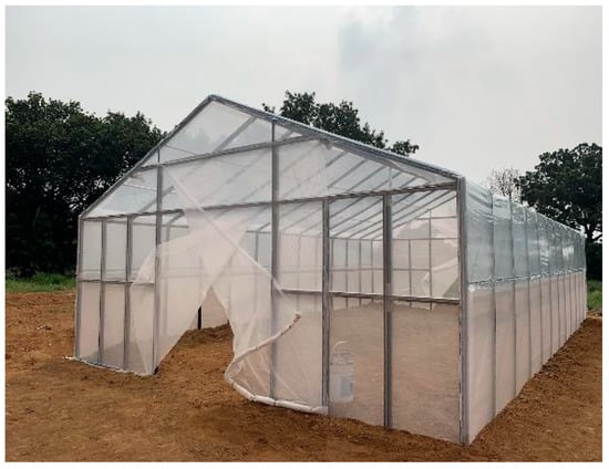 The goal of the on-site construction was to construct a greenhouse covering an area of 60 m2. The sequence of the construction process was: (1) boundary setting and foundation trench excavation, (2) foundation block construction, (3) assembly of the greenhouse walls by connecting the rods with fasteners, (4) connecting the cement foundation blocks to the post rod of each wall with fastener I, (5) securely fixing the bead groove which is used to cover the surface of the greenhouse and each rod, (6) backfilling and irrigating the foundation trench, (7) installing insect net and plastic agricultural film, (8) installing doors and exhaust fans, (9) electricity and water supply configuration, and (10) operation testing of exhaust fans. As opposed to typical greenhouse construction, most of the rods are assembled on the ground first. Therefore, the total construction time is relatively short, and the construction process is much simpler. Figure 10 shows the assembly of all fasteners and rods. Figure 11 shows a photograph of the completed greenhouse.