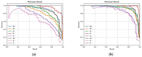 In a multi-classification target detection task, each category can be plotted on a curve, known as a P-R curve, based on recall and accuracy. The average precision (AP) is the area under that curve, and the mean average precision (mAP) is the average value of the APs for each category. The mAP is one of the important indicators of how good a deep learning model is, and its value ranges between 0 and 1: the higher the value, the better the model. To verify the effectiveness of CAFUS and FEM in improving the detection capability of the network, corresponding ablation experiments were conducted to train FPN, FPN with CAFUS, FPN with FEM, and the proposed multi-scale feature network. The experimental results are presented in Figure 6 and Table 2. Comparing the experimental results, it was found that a 5.4% increase in the mAP of the network from 0.817 to 0.871 could be achieved using CAFUS, compared to the FPN using bilinear interpolation for feature map up-sampling. Correspondingly, the introduction of FEM increases the mAP of the network by 0.862. A mAP of 0.929 was achieved when using both CAFUS and FEM for the multi-scale feature network, an increase of 11.2% compared to FPN. This shows that the use of CAFUS can guarantee the up-sampling quality of the high-level feature maps during the multi-scale feature map fusion. Additionally, FEM has a better enhancement effect on the feature representation ability of the feature map.