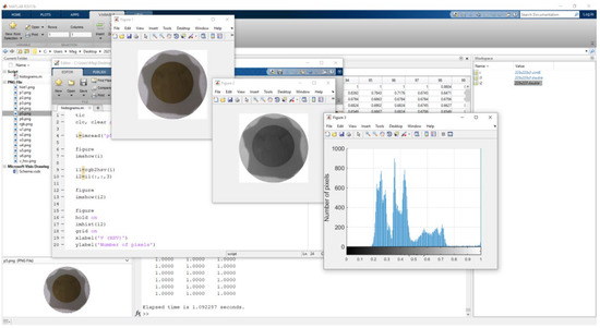 The sample image was transferred to the PC through a mobile phone. Photographs of the partly shaded areas were taken and processed using Matlab 2017b software (The Mathworks Inc., Natick, MA, USA). A sample graph is shown in Figure 1. The image histogram might be used for comparing two histograms from images that have different numbers of pixels. In addition, the range of change of these pixels is important too. The process of obtaining the image histogram of Sample 5 (hexagonal geometry arranged as “Y”) is presented.