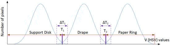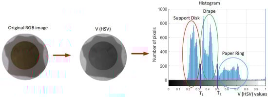 Figure 2 shows the principle of obtaining a fabric drape histogram. The original RGB image is converted to HSV. The data of the converted image are in “double” format. Of the three components of HSV, the V-component represents the regions of interest in the image. These regions are: support disk, drape and paper ring. These regions are indicated on the histogram of the V-component, which changes in the interval [0, 1]. The thresholds for the separation of the three object areas in the histogram, denoted as T1 and T2, respectively, are also shown.