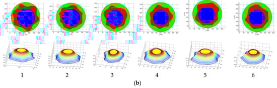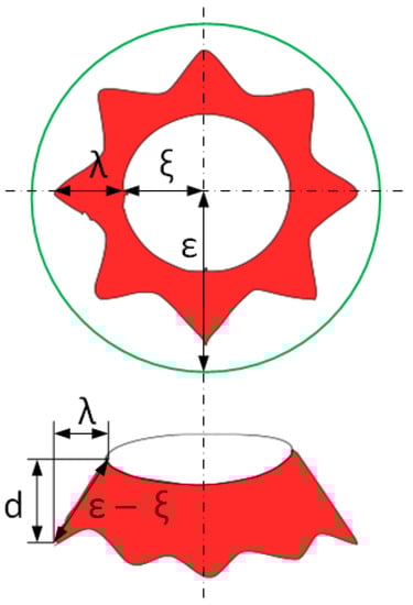 The next part of the algorithm was used to visualize the 3D shape of the fabric drape based on data obtained from the digital image, according to the standard ISO 9073-9; Figure 4 shows how to determine the drape parameters in order to restore its 3D shape. The method corresponds to that presented in Efendioglu et al. []. The most important drape parameters that participate in determining its three-dimensional contour are as follows: radius of the work-piece (ε); support disk radius (ξ); the distance from each point of the outer contour of the drape to the support disk (λ); the height of the draped fabric at each reading point of the drape (d). Hence, the inclined distance (ε-ξ) for each point of the drape contour is determined.