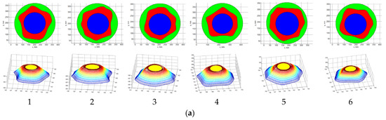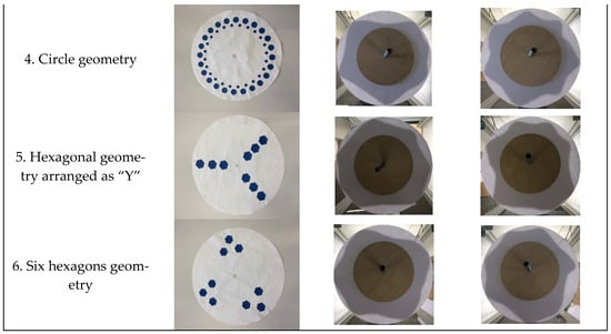 Drape tests of pure textile fabric and fabric with 3D printed geometries show differences in textile fabric given by the shaded areas. The types of single object geometry, their numbers, and their positions on the sample modify the drape of the textile fabric. Figure 6 presents textile samples with 3D printed geometries and the drape profiles of textile samples before and after 3D printing different geometries on them.