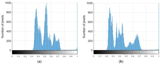 An example of image histograms of drapes. (a) Fabric drape without 3D printing; (b) fabric drape with 3D printed geometries.