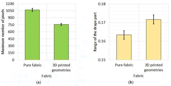 Figure 8 shows the results of determining the maximum number of pixels of the region in the histogram in which the drapery is. This figure represents summarized data for all of the analyzed fabrics: with and without 3D printed geometries with their mean and standard deviation of the number of pixels and range of V (HSV) component for every region of interest in the drape images. It can be seen that the maximum number of pixels is higher for textiles without printing than for those with 3D prints. Conversely, in non-printed textile fabrics, the range of the V-component on which the histograms are made is wider than that in the draperies of 3D printed textile fabrics. In both types of textile fabrics, the highest number of pixels in the histogram of the drapery is observed in hexagonal geometries arranged as “Y” and six-hexagon geometries, and the lowest is observed in those with three-hexagon geometries and circle geometries. The widest ranges of the V-component with a drapery region are observed in the last two mentioned variants, both in the printed and in the unprinted textile fabrics.