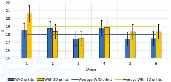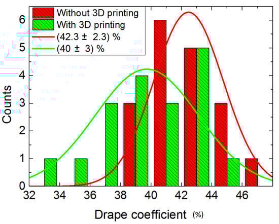 Drape coefficients without and with 3D printed geometries. The values are significantly different at p < 0.05.