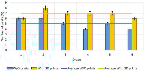 Comparison between obtained number of peaks for drapes with and without 3D printing (N). The values are significantly different at p < 0.05.