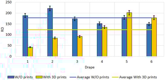 Figure 12 shows changes in RD, according to the type of fabric with and without 3D prints. It can be seen that the application of 3D prints reduces the flexibility of the fabric. It is lowest in samples with tightly spaced prints. The fabric with hexagonal geometry arranged as “Y” has higher values of RD, and the fabrics with triangle geometry prints have lower values of RD.