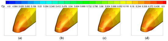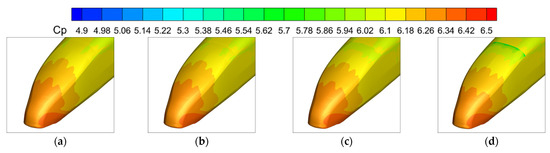 Figure 30 shows the wall shear stress distribution of the rear car of the moving train at position 4 when the plasma device produces different excitation speeds. It can be seen that when the plasma device does not produce excitation, the lower wall shear stress region of the rear car is concentrated in the rear car window and nose tip position. When the excitation velocity ratio V/U = 0.1, the low-stress area at the nose tip of the rear car develops to the maximum and then reaches the minimum value of the wall shear stress; with the further increase in the excitation speed, the low-stress area at the window and the nose tip of the rear car gradually intersect, and the low wall shear stress at the nose tip of the rear car is reduced to the minimum value. As the excitation speed is further increased, the low-stress area at the window and the low-stress area at the tip of the tailgate gradually overlap, and the area of low wall shear stress at the tip of the tailgate decreases rapidly and does not change much.