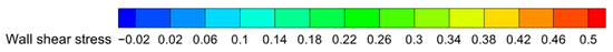 Figure 14 shows the wall shear stress distribution of the moving train rear car at position 1 when the plasma device produces different excitation speeds. It can be seen that when the plasma device does not produce excitation, the lower-shear-stress region of the rear car wall is concentrated at the rear car window and nose tip positions. As the excitation speed increases, the lower-shear-stress region is also gradually expanded, the wall shear stress in this region decreases, the excitation velocity ratio V/U = 0.05, the low-stress region at the window and the low-stress region at the nose tip are correlated, and at this time, it reaches the minimum value of the wall shear stress. The excitation speed is increased again, then the wall shear stress does not decrease, but rather increases, and the wall shear stress is lower in this region. The region of lower wall shear stress decreases rapidly.