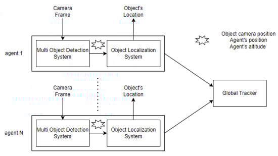 Our system is divided into two subsystems, the localization and tracking system, and the global tracker. The localization and tracking system operates on a single agent level, for each individual agent, while the global tracker system uses inputs from all the UAV agents of the system and produces global information.