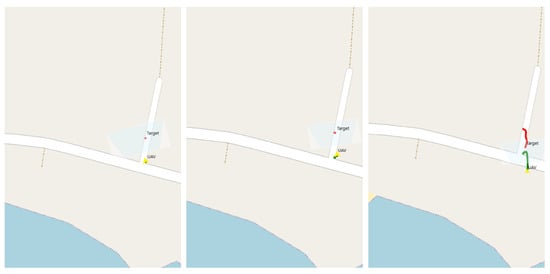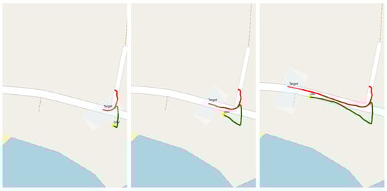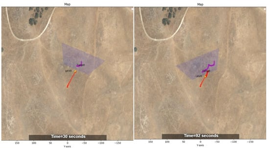 In Figure 16 and Figure 17, the trajectories of the drone (green) and the object (red) are presented alongside the field of view of the drone’s camera. In Figure 18, the scene used for this scenario is presented, where a person walked through the road and the drone followed this specific person. We can observe that our system tested in the simulations, is also efficient in this simple real-world scenario as the only difference is that we trained the system with the VisDrone dataset to detect real objects. The guidance algorithm used in this scenario is the same as the one used in the simulations.