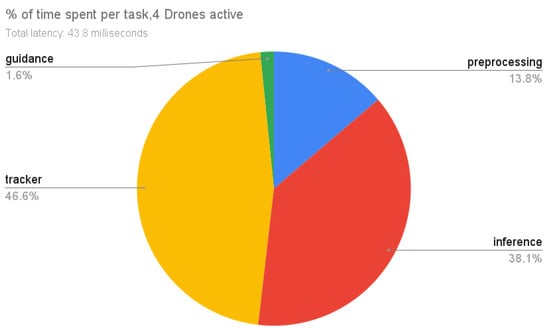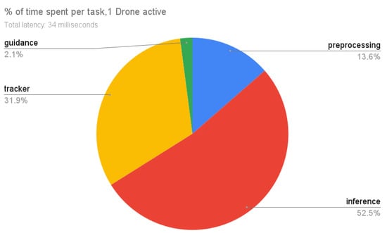 Regarding the results for one drone presented in Figure 19, the system is completing a time-step in 34 milliseconds, a latency suitable for real-time tracking. We can see that most of the time was spent during inference which takes 52.5% of the time. Deep SORT is running for 31.9% of the time it takes to complete one time-step when using one drone and preprocessing takes just 13.6%. Finally, guidance is only responsible for 2.1% of the time spent.