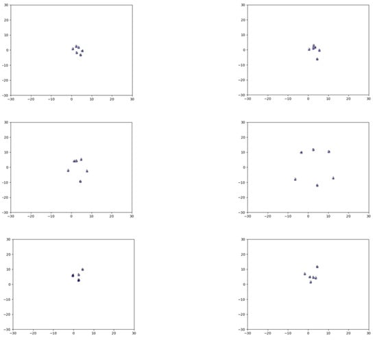 - Cross path with no localization error: This scenario included six actors starting at positions around the centre of the world and all moving towards the centre, causing their paths to cross. After reaching the centre of the world the actors move back to their original positions. For this scenario, no localisation error was considered and the global tracker was fed the ground truth concerning the actor’s positions.
